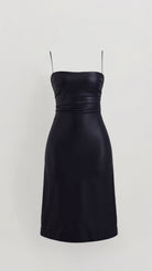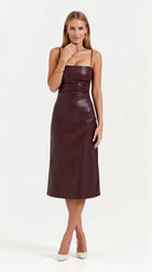 The 'Camellia' dress is luxe minimalism at its finest. This midi masterpiece showcases butter-soft faux leather that hugs every curve, while the straight neckline and thin straps keep things sleek and sophisticated. The fitted silhouette proves that sometimes less is definitely more.