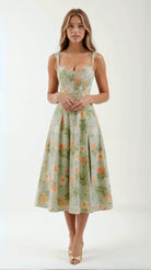 The 'Dahlia' dress is summer romance personified. This dreamy midi features delicate floral jacquard that dances across the fabric, while the bustier-style bodice and soft strap details add that perfect touch of allure. The side slit and flowing skirt ensure every step is a statement.