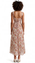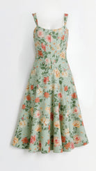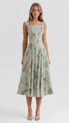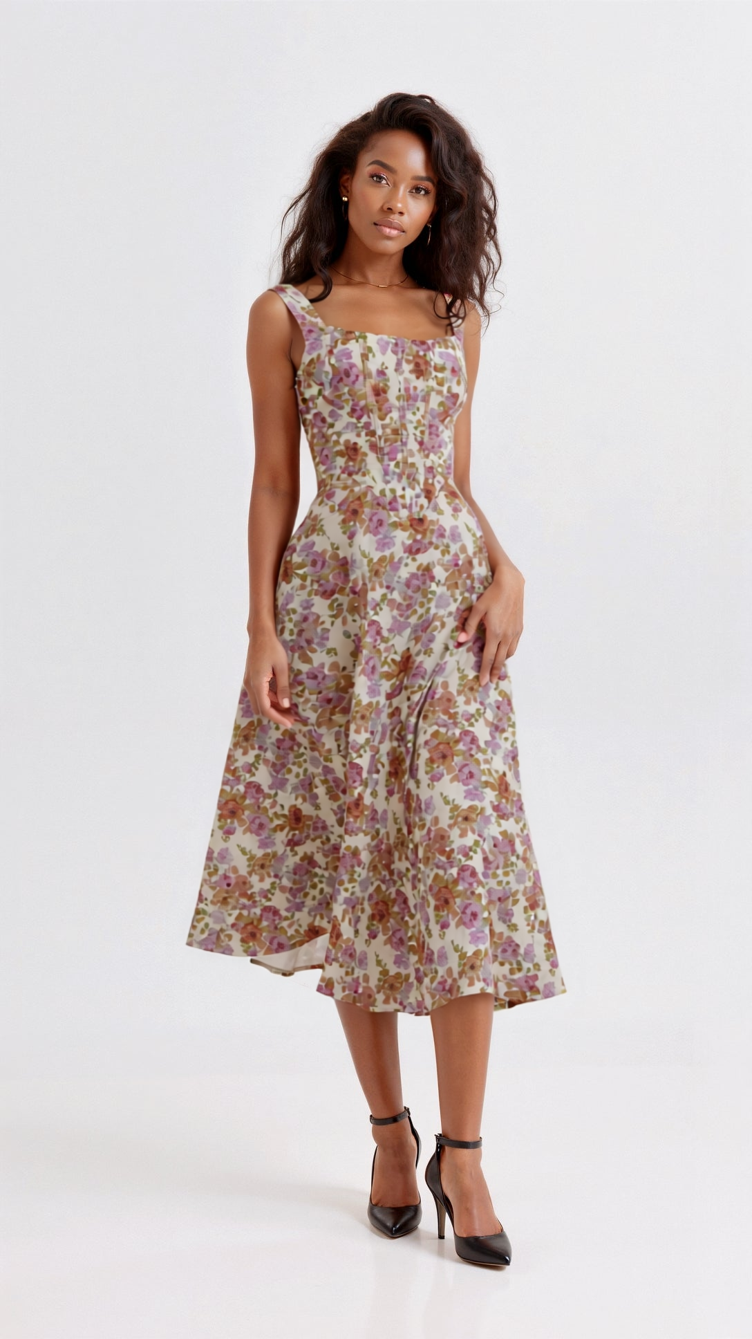 The 'Dahlia Midi Sundress' is cottage core elegance perfected - that enchanting piece that makes you look like effortless romance whether you're at a garden wedding or enjoying a summer celebration. This dreamy stunner features a sweetheart neckline with wide supportive straps and a bustier-style bodice, flowing into a beautifully flared A-line midi skirt with subtle side slit in a vintage floral print.