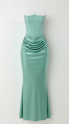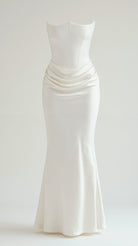 Turn heads with the Fiorella Corset Maxi Dress – a strapless satin evening gown featuring a structured corset bodice and elegant side draping. Perfect for formal occasions and black-tie events.