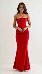 Elevate your evening style with the Fiorella Corset Maxi Dress, a sophisticated masterpiece made for statement moments. Crafted from sleek satin, this strapless dress hugs your curves with its structured corset bodice while the gathered drape detail at the hips adds depth, drama, and feminine allure.