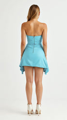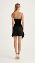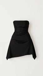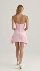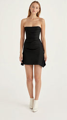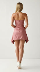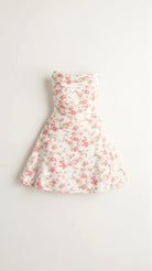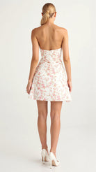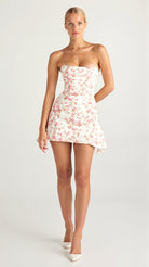 The 'Genevieve' dress is flirty romance in its purest form. This sweet mini features a bustier-style strapless bodice with delicate floral patterns dancing across the fabric. The fitted waist flows into an asymmetric hem that adds playful movement, while the subtle ruching ensures every curve is celebrated.