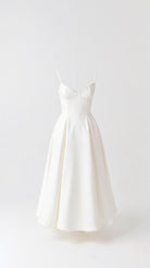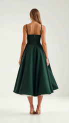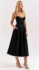 The 'Isolde' dress is timeless sophistication personified. This midi masterpiece features a bustier-style bodice with contrast piping that frames your silhouette perfectly. The fitted waist flows into a full pleated skirt with hidden pockets, while thin straps add that perfect touch of delicacy.