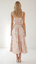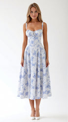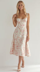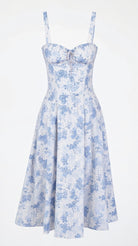 The 'Josie Midi Sundress' is cottage core romance brought to life - that dreamy piece that makes you look like effortless elegance whether you're at a garden wedding or enjoying a sophisticated brunch with friends. This enchanting stunner features a sweetheart neckline with delicate lace-up detail and wide supportive straps, flowing into a beautifully flared A-line midi skirt in a soft vintage floral print.
