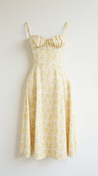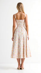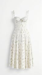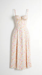The 'Julia' midi dress captures romantic femininity with vintage-inspired charm. This statement piece features a bustier-style bodice with delicate tie detail and a flowing A-line skirt with graceful front slit.