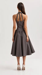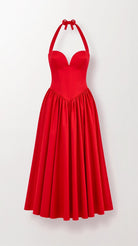 The 'Katarina' dress is vintage glamour redefined. This stunning piece features a bustier-style bodice with a plunging sweetheart neckline, while the halter straps add that perfect retro touch. Available in smoke grey and statement red, this full-skirted silhouette creates dramatic volume that's made for turning heads.