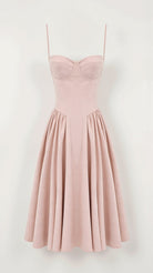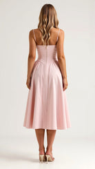 Exude timeless beauty in the Odette Corset Midi Dress, featuring a flattering bustier-style bodice and a graceful pleated midi skirt. Perfect for cocktail parties and elegant occasions.