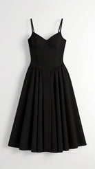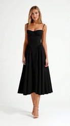Step into timeless sophistication with the Odette Corset Midi Dress. Designed with a structured bodice and soft pleated skirt, this black midi dress beautifully blends vintage charm with a flattering modern silhouette. The corset-style top enhances the waist, while the full skirt adds graceful movement to every step.