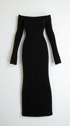 The 'Quinlan' Ribbed Maxi Dress is your new go-to for effortless elegance with its figure-hugging ribbed texture, sultry off-shoulder neckline, and dramatic bell sleeves that add just the right amount of drama to your look.