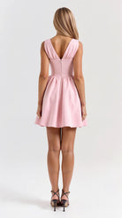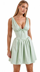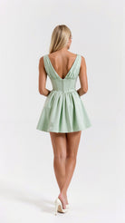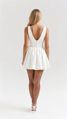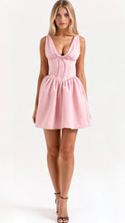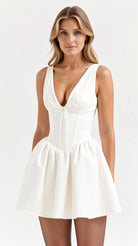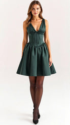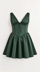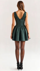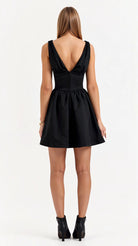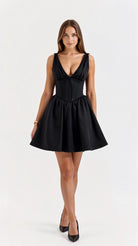 The 'Seraphina' dress is dark romance reimagined. This show-stopping mini features a plunging neckline with delicate gathering that creates alluring drama, while the bustier-style waist sculpts the perfect silhouette. The voluminous skirt with precise pleating adds that perfect touch of theatrical flair.