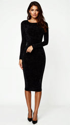 The 'Seraphine' glitter midi dress is pure elegance with attitude. Crafted from our signature stretch fabric infused with delicate shimmer, this figure-sculpting silhouette works overtime to keep you looking flawless. The classic crew neck and long sleeves create a sophisticated canvas for the dress's show-stopping sparkle effect.