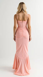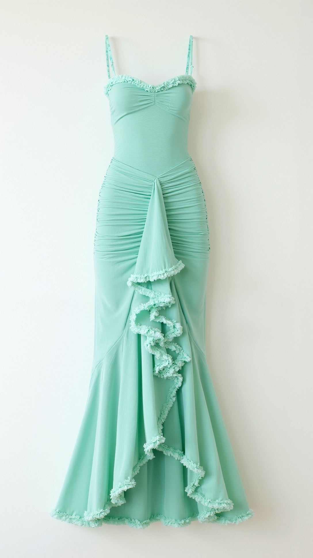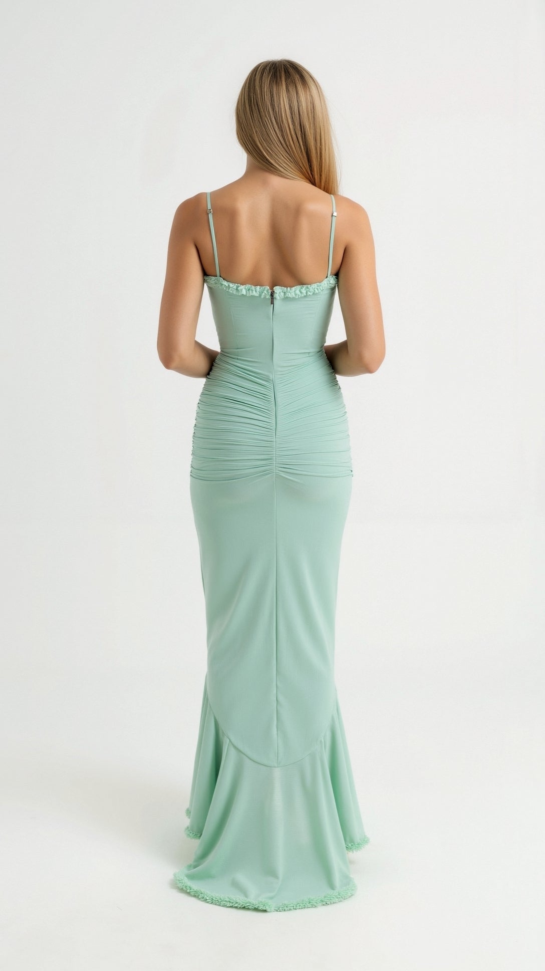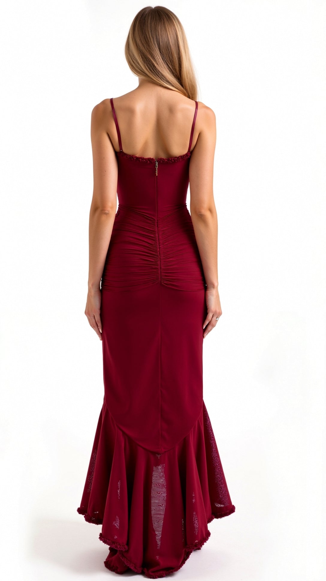 - Flattering Fit: The carefully structured bodice and elegant ruched detailing beautifully shape the figure, while the flowy, asymmetrical skirt adds movement and grace.
