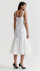 The 'Xanthe' dress is ethereal elegance personified. This pristine white midi features delicate broderie anglaise fabric and a bustier-style bodice that creates the perfect silhouette. The voluminous tiered skirt adds just the right amount of drama, while wide straps offer effortless support.